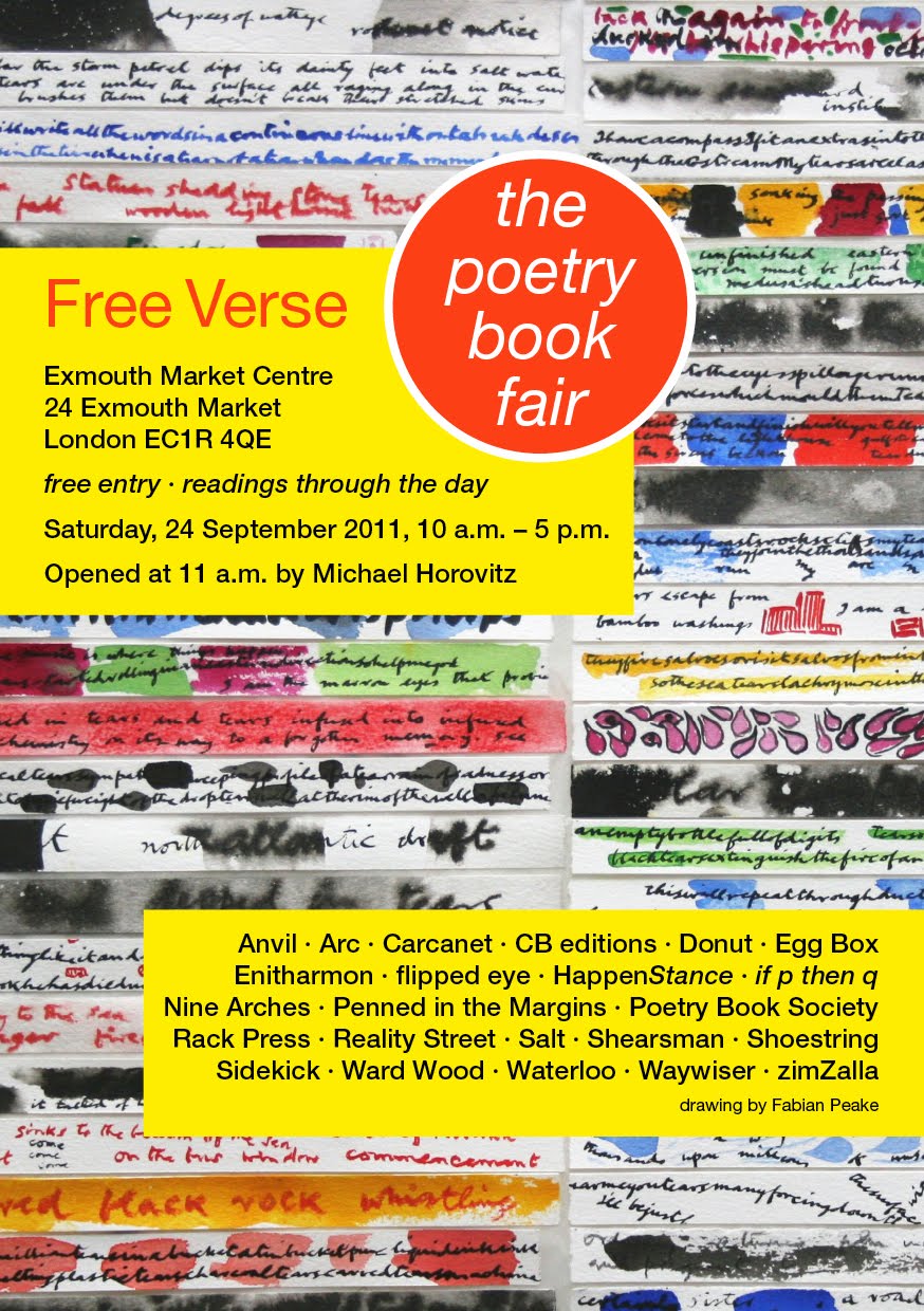 First stop, the Free Verse Poetry Book Fair at Exmouth Market, organised by the excellent CB editions. An inspiring, if slightly overwhelming, event – more than 20 small poetry presses plying their wares, and free readings going on throughout the day. Half an hour’s browsing resulted in the purchase of six books, plus a good gathering of leaflets and postcards. Then upstairs to catch the final reading, by a trio of poets from Waterloo Press: Niall McDevitt, Philip Ruthen and Jeremy Reed. All intense performers of their work, in different ways. A bubble of concentrated poetic energy in a rather poky room above a church hall; Jeremy Reed bringing a flourish of glamour to the space, tossing handfuls of sequins up in the air to shower down on us mortals.