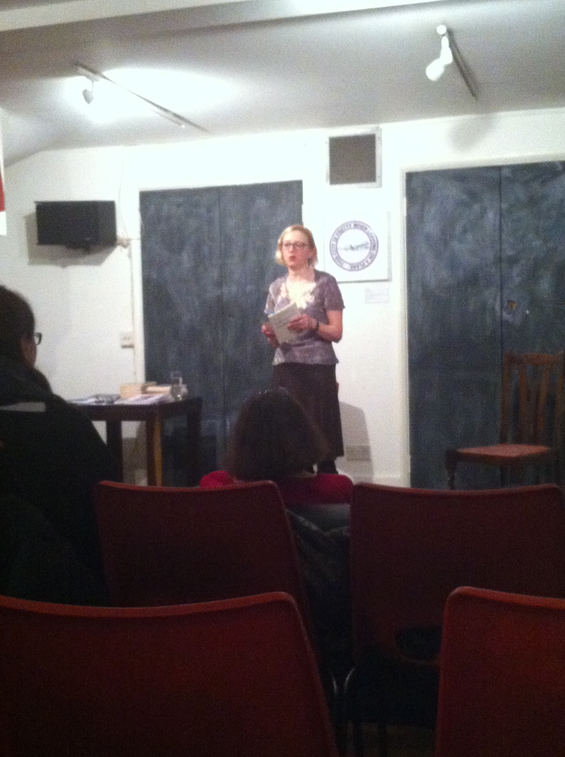 Wednesday night was blowing a gale in London, but the threatened tube strike had been suspended, and the day’s lashing rain finally dried up. So, given the circumstances, there was a good turn out for Loose Muse at the Poetry Café, where I was billed as one of the two featured writers. Unfortunately, Sally Spedding, the other invited writer for February, couldn’t make it down from Wales due to the horrendous weather. But it was still a full evening. The first half saw Claire Booker‘s short play, Last Man in Watford, energetically performed by three young actors. Claire’s play, an acerbic future vision of the world ruled by women, went down a treat with the mostly female audience. Claire then read a few of her poems, and I particularly enjoyed her poem about a double bassist’s relationship with his instrument – pun most definitely intended.