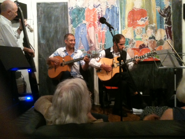 The Crispy Hot Club performed Django Reinhardt inspired tunes, and their foot-tappingly, knee-jigglingly irresistible music contributed to the French flavour of the evening. Host Hylda Sims read a sequence of tender yet funny poems arising from an intense platonic relationship with her much younger French lodger, Jean-Noël, several years ago. She also sang a great version of Chattanooga Choo Choo, backed by the band, with two of her own verses celebrating the joys of travelling by Eurostar and arriving in Paris. I wanted to book a ticket there and then. In the second half, Hylda’s poems drew vividly on her now annual summer visit to Jean-Noël and his family in la France profonde. I’ll be thinking about her on le quinze août and the strange local festival where young men try to sever the head of a dead goose suspended above the main street.