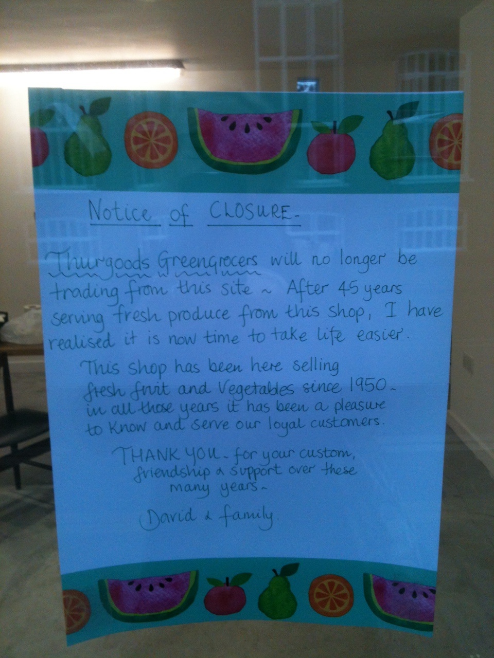 About a year ago, our local greengrocer closed temporarily for a radical refurbishment, including the addition of a flat over the shop. We resigned ourselves to several months of mildly-aggravating and bit-more-expensive fruit and vegetable shopping in the nearby supermarket, softened by the anticipation of when-Thurgoods-reopens, hoping it would be perhaps a little smarter but still a good and proper greengrocers. With the odd stray apostrophe. Scaffolding went up. A new storey went up. Months passed. Scaffolding came down. Metal shutters covered the shopfront. Estate agent sign appeared: Maisonette for sale. The maisonette sold. Every time we passed, the shutters were down. Only today, as I headed up Queenstown Road, I noticed a light, the shutters up, and this sad notice taped to the window: