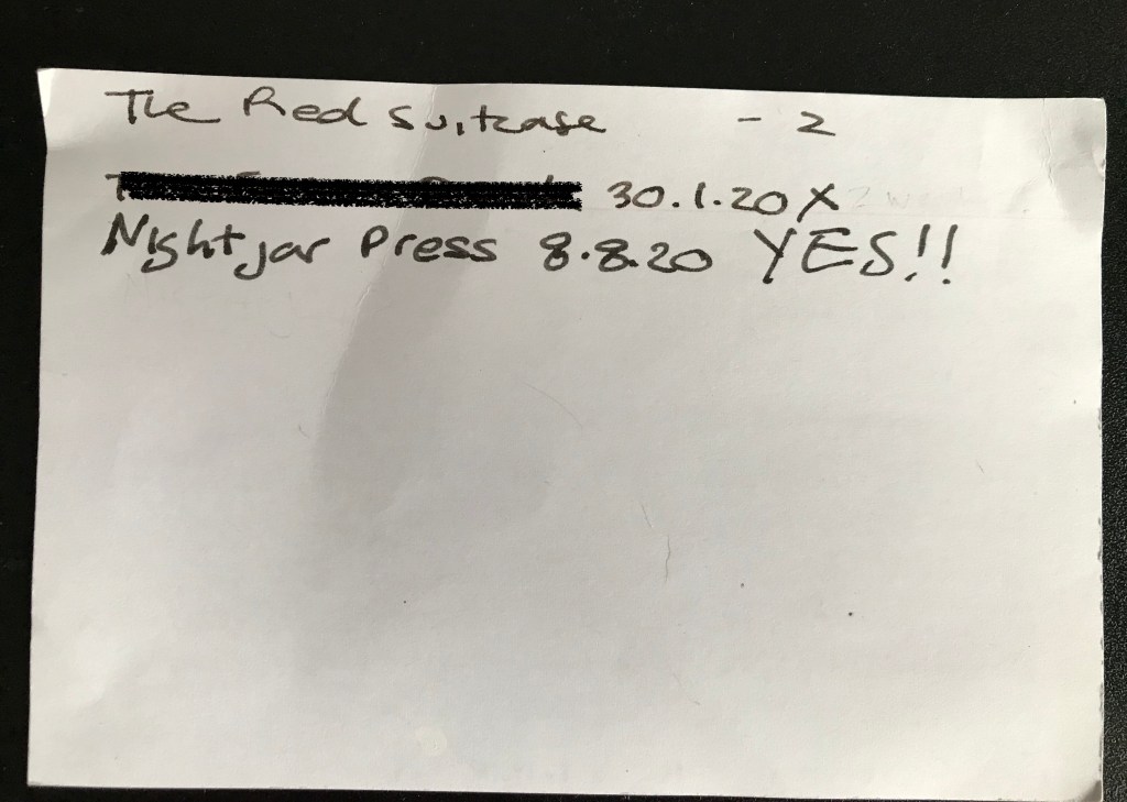 Over the next week I reviewed The Red Suitcase. I made a few edits, mainly to the opening. I’ve definitely got better at editing my work since writing more poetry, and specifically thanks to the mentoring Joolz Sparkes and I received from Jacqueline Saphra as part of our Arts Council funding for London Undercurrents in 2017/18. On the 8th of August I emailed The Red Suitcase to Nicholas Royle. The following day he replied saying he loved it and would love to publish it. YES!! My hand was shaking with excitement when I wrote that on the index card.