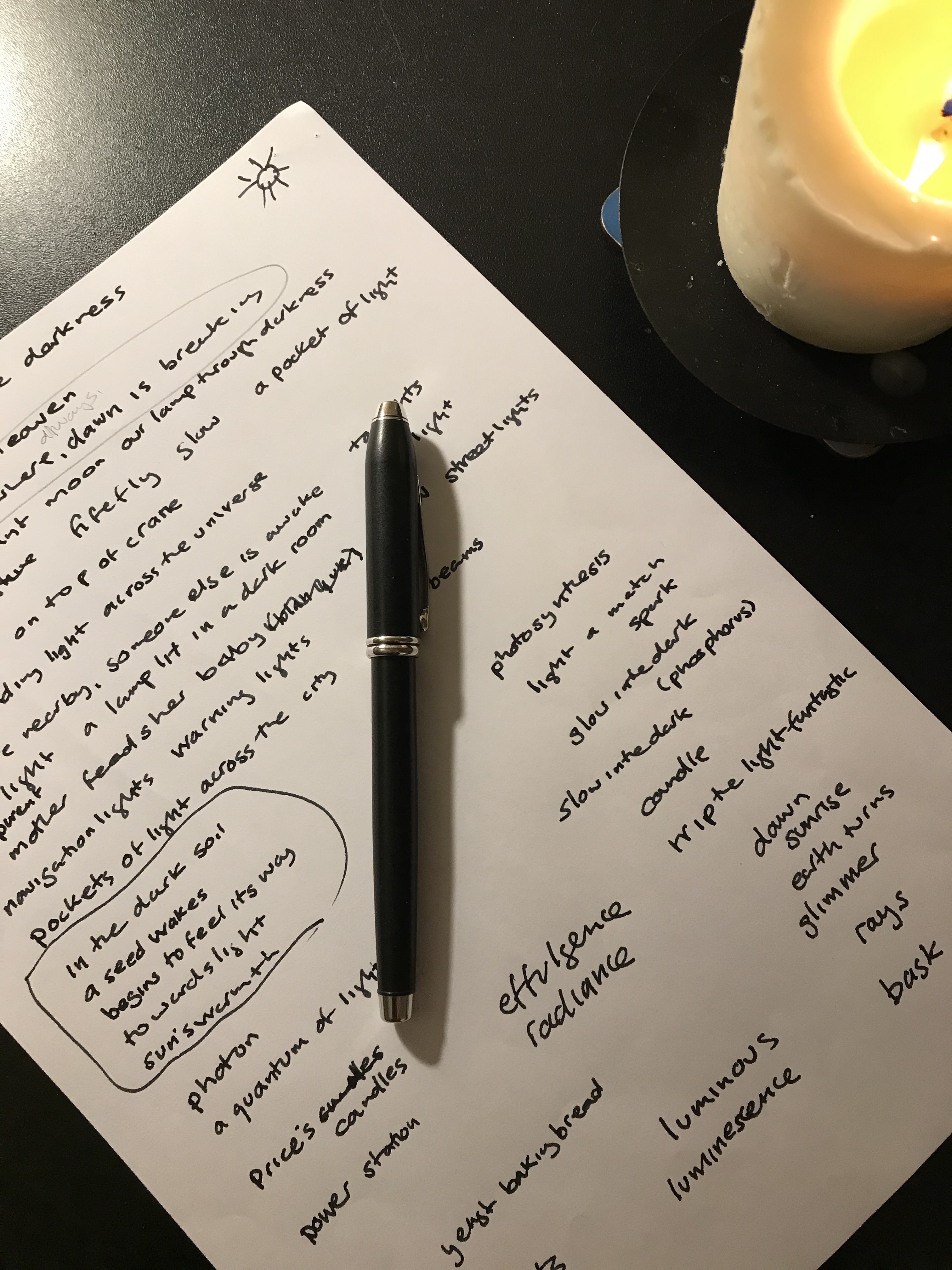 The following day I sat at my desk and started jotting down some words. Part of our brief was to include the word LIGHT somewhere in the design. I was thinking too about how to write a text that would work across the two windows. I played around with some short forms and finally settled on a mesostic – a variation on an acrostic, in this form the letters in the middle of each line spell out a word when read downwards. I emailed it to Luke and happily he loved it! Since then, most of the work has been on Luke’s plate. He’s come up with a beautiful design, going for a ‘less is more’ approach; and then there’s all the technical and logistics side, how to print it and apply it to the windows, how to light it, and liaising with the different contractors involved. We’re hopefully on track to have it in place by 5th December and I really can’t wait to see it up there, beaming out to passers-by.