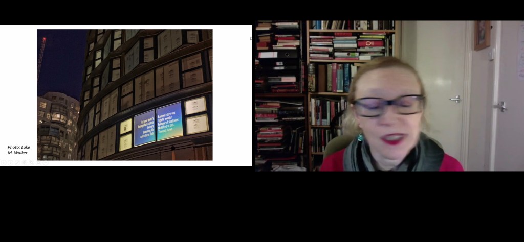There were around 18 people in the audience, including Joolz and most of my fellow Battersea Society Heritage Committee members – friendly faces! Sara introduced me, muted everyone else, and off I went. I started with a couple of ‘seasonal’ poems, based on memories of Christmas and the long summer school holidays in Australia, which take place in January. Following that, I read a few short poems from indoors looking out accompanied by images of the pages that Stephen Graham created for the booklet. Then poems from London Undercurrents, starting with the clip of Joolz reading, after which I took up the reins again, and enjoyed inhabiting these poems that we put so much love and work into. And finally I read some of the many poems I’ve written inspired by Battersea Park, and finished with the short mesostic poem I wrote for the Nine Elms Advent window collaboration with the artist Luke M. Walker. The Battersea Society sponsored our window, so it felt fitting to end here.