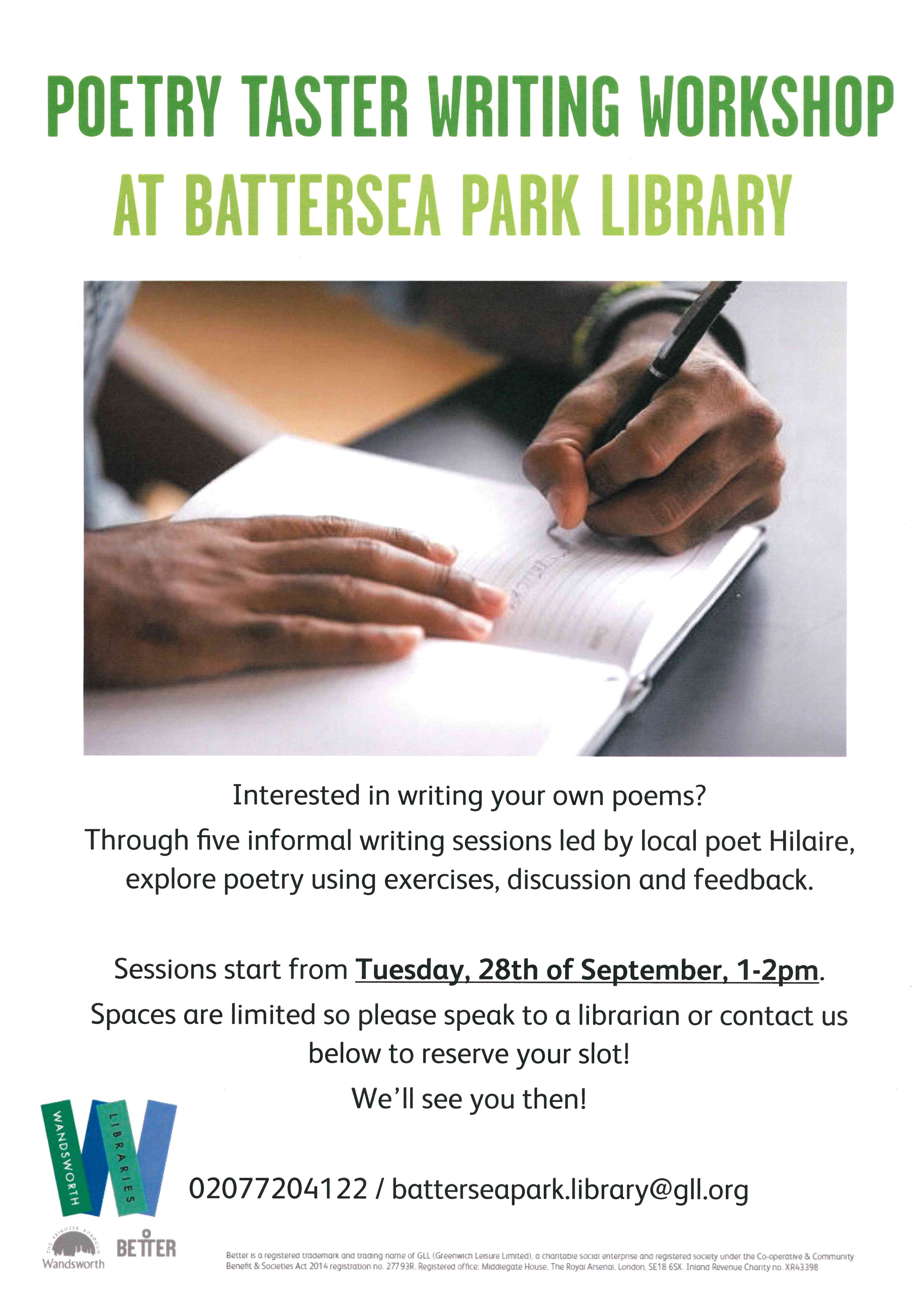And in other other news, I’m preparing to run a series of free poetry taster workshops at my local Battersea Park library, starting on Tuesday 2nd November. The sessions are designed for adults with little or no experience of writing poetry to take their first steps in an informal and supportive environment. Spaces are limited so please contact the library if you are interested on 020 7720 4122 or batterseapark.library@gll.org