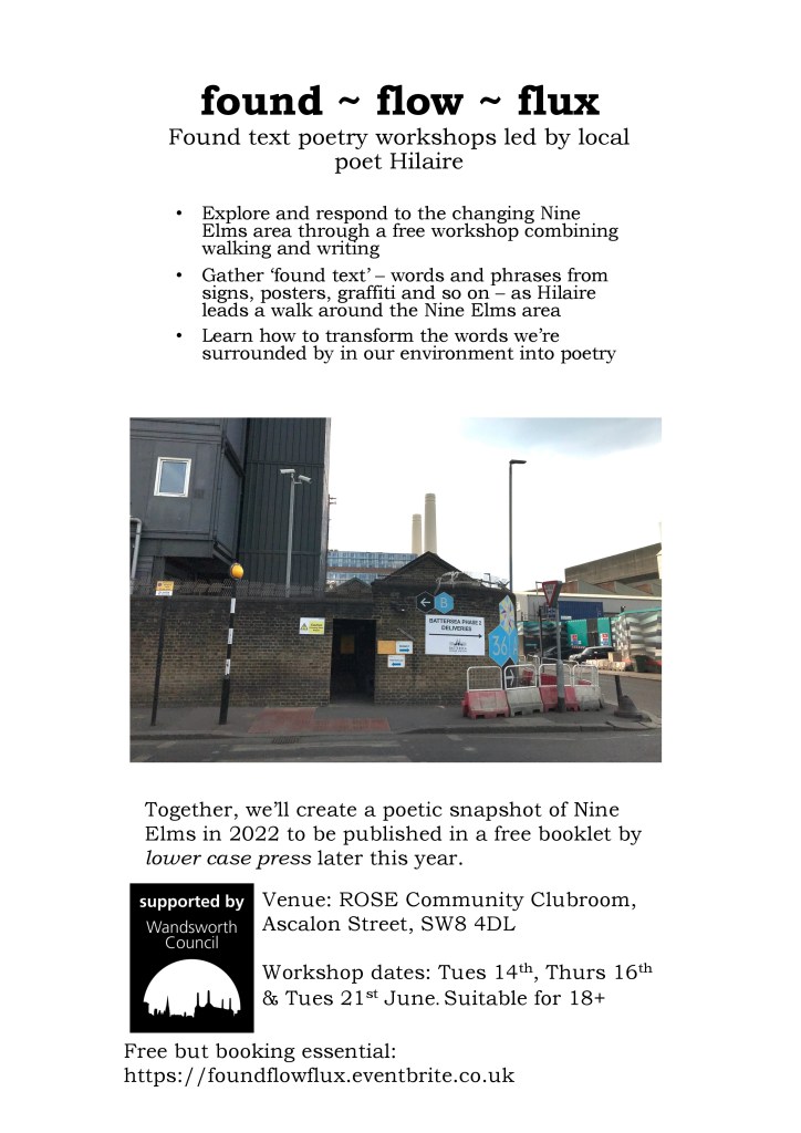 No sooner had I packed away my judge’s wig, than my focus shifted to planning the found text poetry workshops I’m delivering in June as part of my found ~ flow ~ flux commission from Wandsworth Council. I’ve devised three different walk routes, one for each workshop, each one passing through or alongside several of the new developments in Nine Elms. I’ve also made a poster to distribute locally, and set up registration details on Eventbrite, which went live earlier this week. The next steps are to finalise the content of the workshops and continue promoting them.