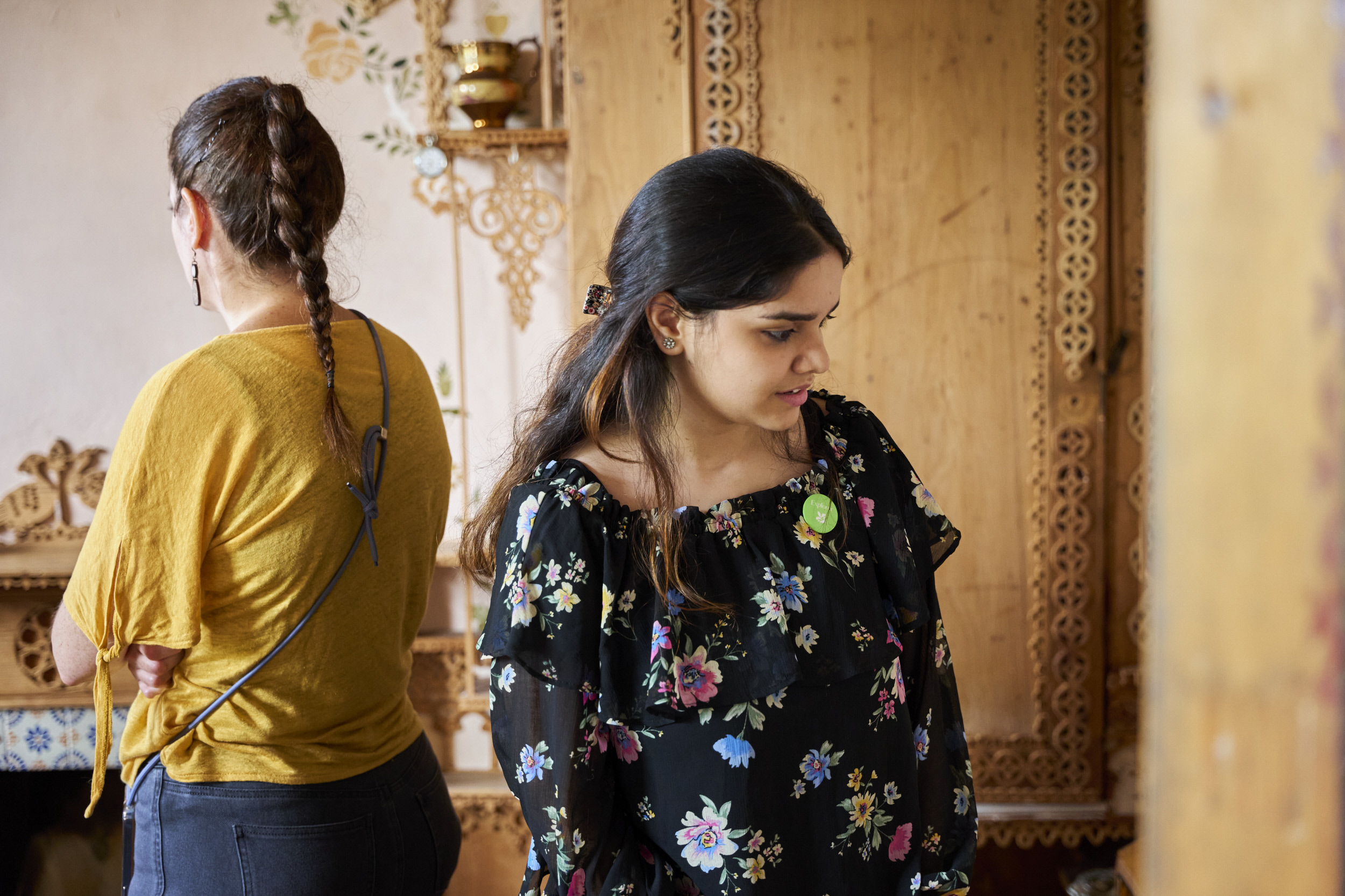 Two women standing in a room, one with her back to the camera and the other looking slightly downwards to the right. Behind them there is carved fretwork on a wooden wardrobe, stencilled flower and leaf patterns on a cream wall, and more carved fretwork above a fireplace. A lustreware jug stands on a small plinth attached to the side of the wardrobe.