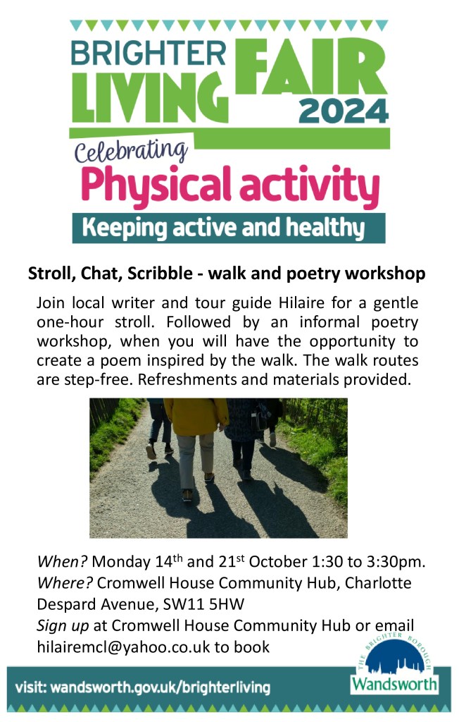 As part of this month-long celebration of ageing well, I’m pleased to have received a micro grant to lead two walks and poetry workshops. Starting at Cromwell House Community Hub, we’ll go for a walk locally at an easy pace for about an hour. Back at the Hub I’ll lead people through writing a poem based on what we’ve seen on the walk.